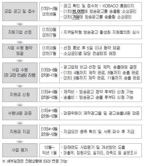 올해 지역밀착형 방송광고 활성화 기반구축사업 지원기업을 대폭 확대했습니다. 올해 1차 공모에서 180개 사업자, 2차 공모(6월 중)에서는 77개의 사업자를 선정합니다.