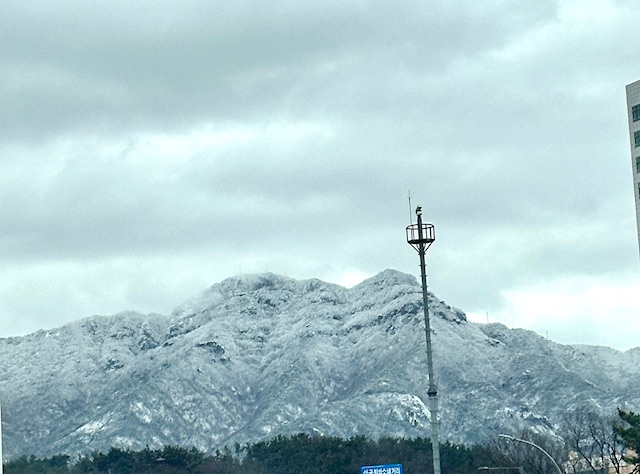 금요일 점심을 먹으러 가는 길 흰 눈이 가득한 금오산을 보게 되었습니다.